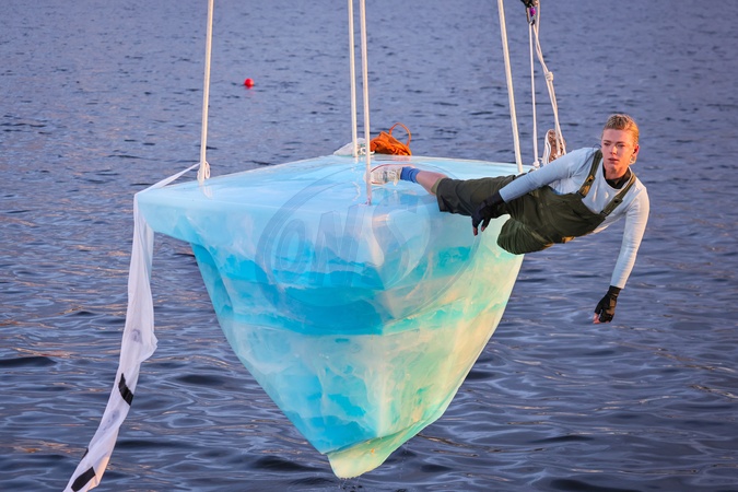 London,UK, 24th Aug 2024. 3rd performance, performer: Anna. THAW is the European premiere of a performance by Australian physical theatre company Legs On The Wall in response to the devastating bushfires of 2019/20 and global climate change. The performance, taking place at the University of East London's Docklands Campus, brings spectators face to face with the urgent need for global climate action through a performance over 8 hours and sees a performer on a giant melting 2.5 tonne block of ice suspended from a tall crane, with Canary Wharf, City Airport and Woolwich in the backgroud., Credit:Avalon
