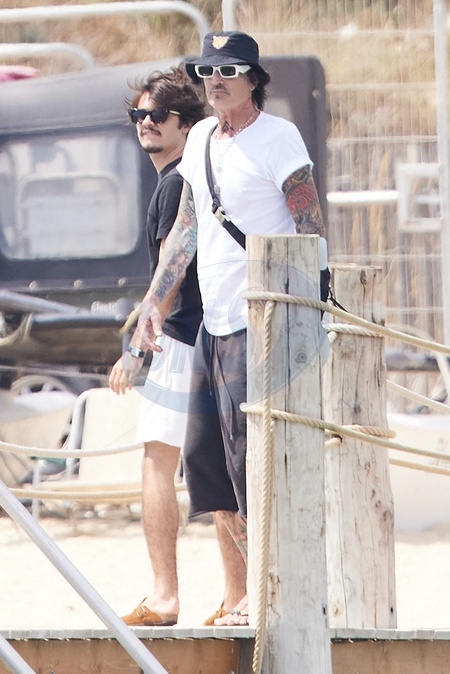 Exclusif - Prix Spécial - No web - Tommy Lee, 61 ans, et ses fils Brandon, 28 ans, et Dylan, 26 ans, arrivent sur une plage de Saint-Tropez pour aller déjeuner, le 25 août 2024. Exclusive - Special Price - No web - Tommy Lee, 61, and his sons Brandon, 28, and Dylan, 26, arrive at a beach in Saint-Tropez for lunch on August 25, 2024.