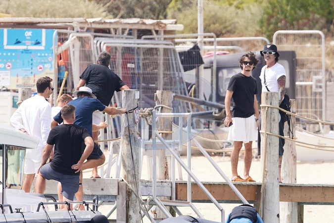 Exclusif - Prix Spécial - No web - Tommy Lee, 61 ans, et ses fils Brandon, 28 ans, et Dylan, 26 ans, arrivent sur une plage de Saint-Tropez pour aller déjeuner, le 25 août 2024. Exclusive - Special Price - No web - Tommy Lee, 61, and his sons Brandon, 28, and Dylan, 26, arrive at a beach in Saint-Tropez for lunch on August 25, 2024.