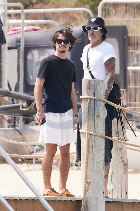 Exclusif - Prix Spécial - No web - Tommy Lee, 61 ans, et ses fils Brandon, 28 ans, et Dylan, 26 ans, arrivent sur une plage de Saint-Tropez pour aller déjeuner, le 25 août 2024. Exclusive - Special Price - No web - Tommy Lee, 61, and his sons Brandon, 28, and Dylan, 26, arrive at a beach in Saint-Tropez for lunch on August 25, 2024.