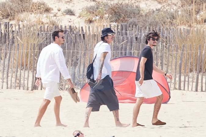 Exclusif - Prix Spécial - No web - Tommy Lee, 61 ans, et ses fils Brandon, 28 ans, et Dylan, 26 ans, arrivent sur une plage de Saint-Tropez pour aller déjeuner, le 25 août 2024. Exclusive - Special Price - No web - Tommy Lee, 61, and his sons Brandon, 28, and Dylan, 26, arrive at a beach in Saint-Tropez for lunch on August 25, 2024.