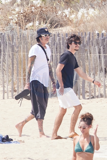 Exclusif - Prix Spécial - No web - Tommy Lee, 61 ans, et ses fils Brandon, 28 ans, et Dylan, 26 ans, arrivent sur une plage de Saint-Tropez pour aller déjeuner, le 25 août 2024. Exclusive - Special Price - No web - Tommy Lee, 61, and his sons Brandon, 28, and Dylan, 26, arrive at a beach in Saint-Tropez for lunch on August 25, 2024.