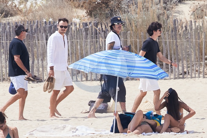 Exclusif - Prix Spécial - No web - Tommy Lee, 61 ans, et ses fils Brandon, 28 ans, et Dylan, 26 ans, arrivent sur une plage de Saint-Tropez pour aller déjeuner, le 25 août 2024. Exclusive - Special Price - No web - Tommy Lee, 61, and his sons Brandon, 28, and Dylan, 26, arrive at a beach in Saint-Tropez for lunch on August 25, 2024.