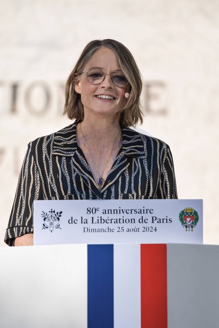 Jodie Foster i Prezydent Emmanuel Macron podczas uroczystości upamiętniających 80. rocznicę wyzwolenia paryskiego Place Denfert-Rochereau