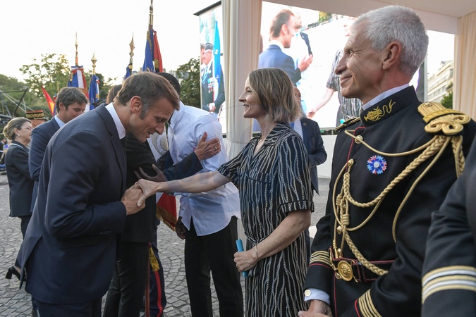 Jodie Foster i Prezydent Emmanuel Macron podczas uroczystości upamiętniających 80. rocznicę wyzwolenia paryskiego Place Denfert-Rochereau