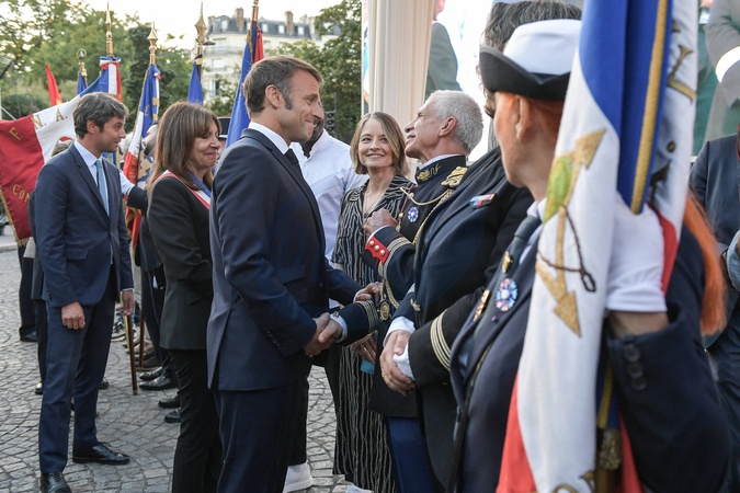 Gabriel Attal, premier ministre, Anne Hidalgo, maire de Paris, Le président Emmanuel Macron, Jodie Foster - Le président E.Macron lors de la cérémonie de commémoration du 80ème anniversaire de la libération de Paris Place Denfert-Rochereau le 25 août 2024 © Isa Harsin / Pool / Bestimage President E.Macron at the ceremony commemorating the 80th anniversary of the liberation of Paris at Place Denfert-Rochereau on august 25th 2024