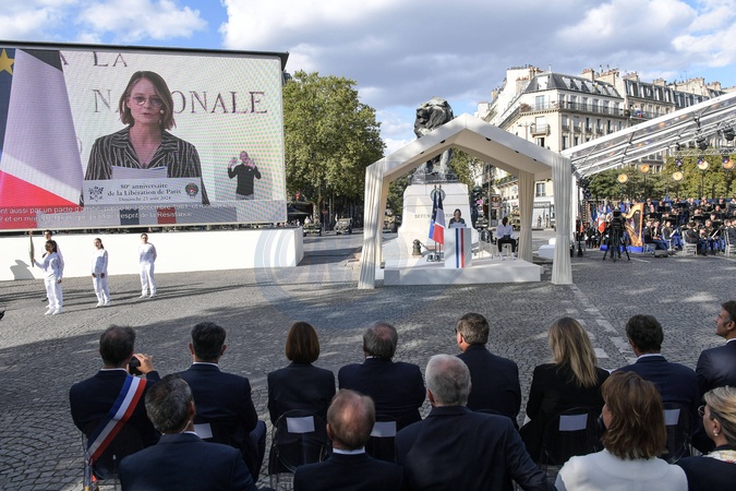 Jodie Foster - Le président E.Macron lors de la cérémonie de commémoration du 80ème anniversaire de la libération de Paris Place Denfert-Rochereau le 25 août 2024 © Isa Harsin / Pool / Bestimage President E.Macron at the ceremony commemorating the 80th anniversary of the liberation of Paris at Place Denfert-Rochereau on august 25th 2024