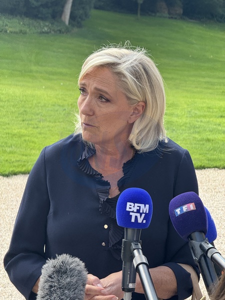 Marine Le Pen et Jordan Bardella sortent de leur entretien avec le président de la République à l'Elysée le 26 août 2024. © Christophe Clovis / Bestimage