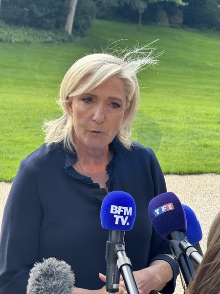 Marine Le Pen et Jordan Bardella sortent de leur entretien avec le président de la République à l'Elysée le 26 août 2024. © Christophe Clovis / Bestimage