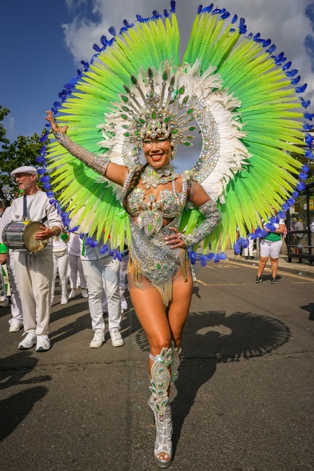 Notting Hill Carnival Monday procession and revellers, London, UK