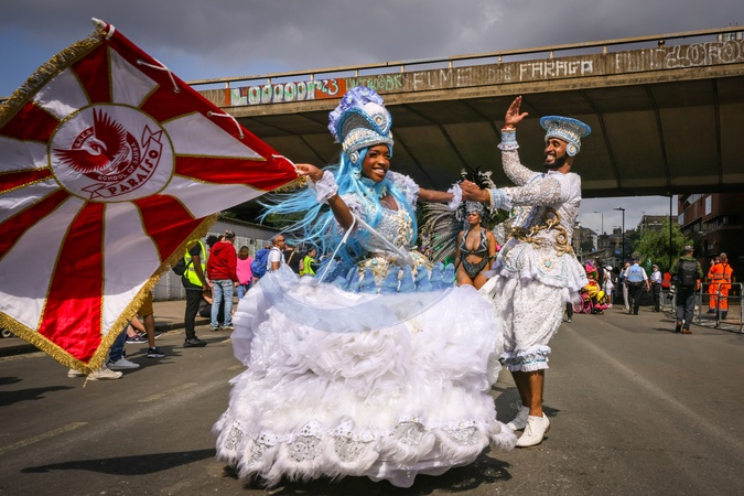 London,UK, 26th Aug 2024. The prince and princess, both senior performers, dance along the route. Participants with the Paraiso School of Samba, one of the largest groups with nearly 200 performers and musicians, dance, drum and pose up a storm along the route. Notting Hill Carnival on Monday sees the main carnival procession of mas bands, drummers and Caribbean and South American Salsa, Samba and Soca groups. Revellers celebrate the Bank Holiday Weekend participating or watching along the carnival route, at sounds systems, stalls and venues on the second of two days of Notting Hill Carnival festivities., Credit:Avalon