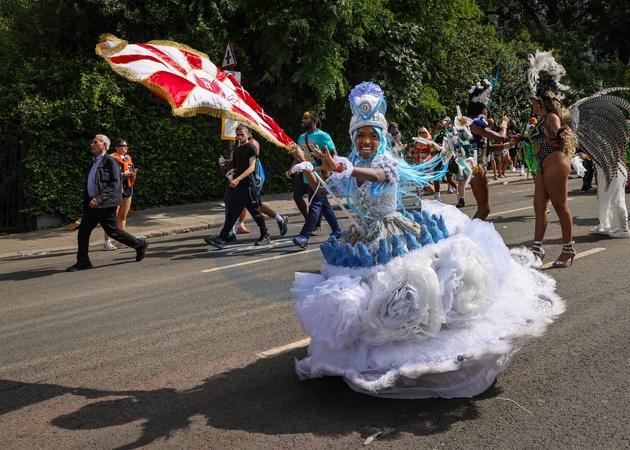 Notting Hill Carnival Monday procession and revellers, London, UK