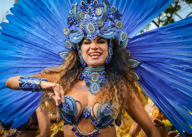 Notting Hill Carnival Monday procession and revellers, London, UK