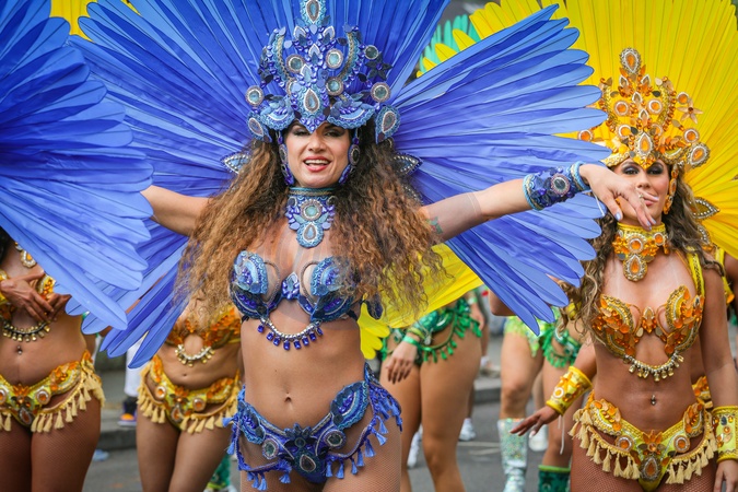 Notting Hill Carnival Monday procession and revellers, London, UK