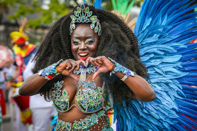 Notting Hill Carnival Monday procession and revellers, London, UK