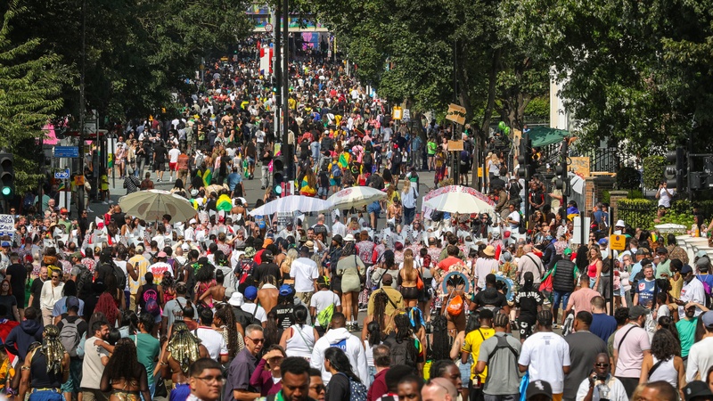 Poniedziałkowa procesja i biesiadnicy w Notting Hill Carnival, Londyn, Wielka Brytania