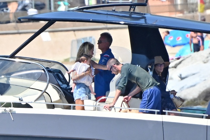 Exclusif - Prix Spécial - No Credit - BI - Sienna Miller et son compagnon Oli Green, avec leur fille de sept mois, sur un yacht à Saint-Tropez, le 22 août 2024. Déjà maman d'une fille de 11 ans, née de sa relation avec T.Sturridge, Sienna Miller a retrouvé les joies de la maternité, le 3 janvier dernier avec son cher et tendre, Oli Green. Merci de filouter le visage des enfants avant publication. Exclusive - Special Price - No Credit - BI - Sienna Miller and her partner Oli Green, with their seven-month-old daughter, on a yacht in Saint-Tropez, August 22, 2024. Already the mother of an 11-year-old daughter, born from her relationship with T. Sturridge, Sienna Miller rediscovered the joys of motherhood on January 3 with her dear and tender, Oli Green. Please pixelate children faces before publication.