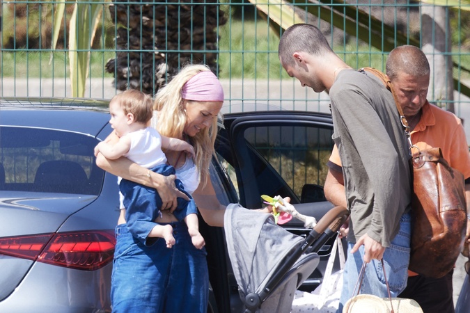 Exclusif - Prix Spécial - No Credit - BI - Sienna Miller, son compagnon Oli Green et leur fille de sept mois prennent un vol à l'aéroport de Nice, le 24 août 2024. Déjà maman d'une fille de 11 ans, née de sa relation avec T.Sturridge, Sienna Miller a retrouvé les joies de la maternité, le 3 janvier dernier avec son cher et tendre, Oli Green. Merci de filouter le visage des enfants avant publication Exclusive - Special Price - No Credit - BI - Sienna Miller, her partner Oli Green and their seven-month-old daughter take a flight at Nice airport on August 24, 2024. Already the mother of an 11-year-old daughter, born from her relationship with T. Sturridge, Sienna Miller rediscovered the joys of motherhood on January 3 with her dear and tender, Oli Green. Please pixelate children faces before publication.