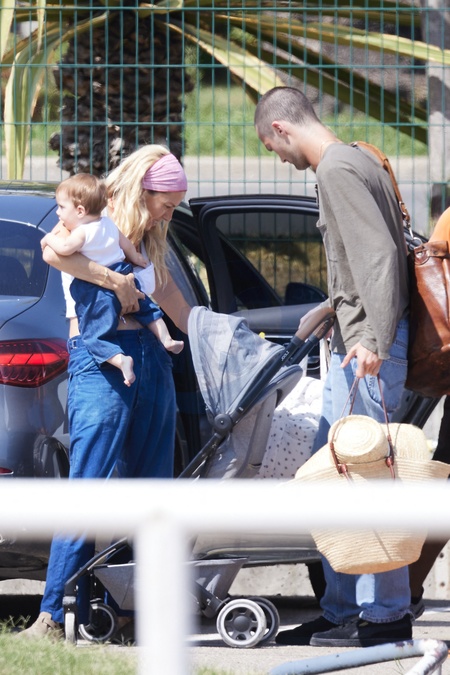 Exclusif - Prix Spécial - No Credit - BI - Sienna Miller, son compagnon Oli Green et leur fille de sept mois prennent un vol à l'aéroport de Nice, le 24 août 2024. Déjà maman d'une fille de 11 ans, née de sa relation avec T.Sturridge, Sienna Miller a retrouvé les joies de la maternité, le 3 janvier dernier avec son cher et tendre, Oli Green. Merci de filouter le visage des enfants avant publication Exclusive - Special Price - No Credit - BI - Sienna Miller, her partner Oli Green and their seven-month-old daughter take a flight at Nice airport on August 24, 2024. Already the mother of an 11-year-old daughter, born from her relationship with T. Sturridge, Sienna Miller rediscovered the joys of motherhood on January 3 with her dear and tender, Oli Green. Please pixelate children faces before publication.