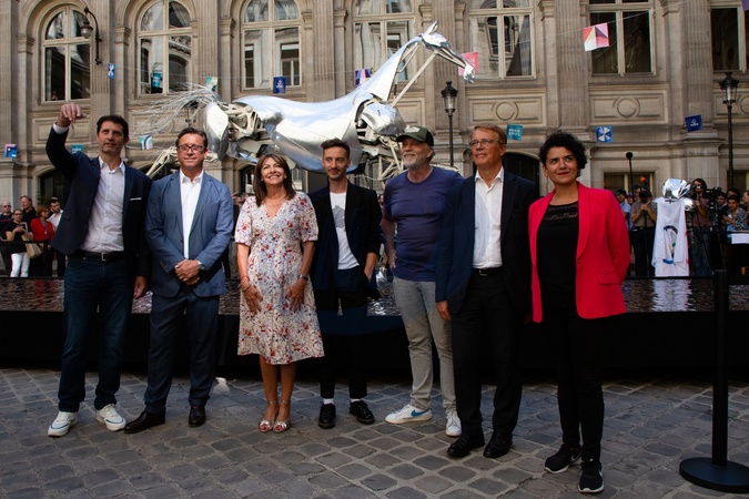 CB - Anne Hidalgo et Thomas Jolly lors de l'inauguration de l'exposition "Zeus / Ville de Paris", le cheval métallique de la cérémonie d'ouverture des Jeux Olympiques Paris 2024, à l'Hôtel de Ville de Paris