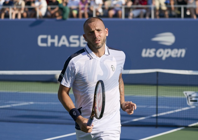 Dan Evans runs to the back of the court during the longest match in US Open history in the first round on court 6 at the 2024 US Open Tennis Championships at the National Tennis centre, New York, New York, 27 Aug 2024., Credit:Peter van den Berg / Avalon