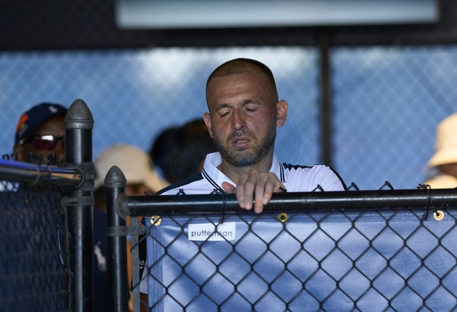 Dan Evans looks exhausted as he leaves court of a toilet break during the longest match in US Open history in the first round on court 6 at the 2024 US Open Tennis Championships at the National Tennis centre, New York, New York, 27 Aug 2024., Credit:Peter van den Berg / Avalon