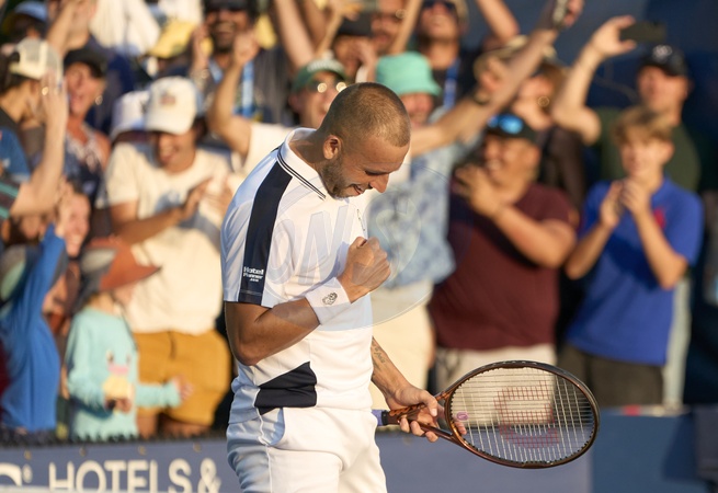Dan Evans celebrates match point against Karen Khachanov after the longest match in US Open history in the first round on court 6 at the 2024 US Open Tennis Championships at the National Tennis centre, New York, New York, 27 Aug 2024., Credit:Peter van den Berg / Avalon