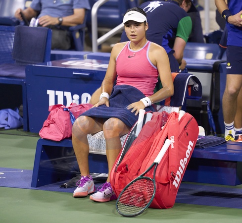Emma Raducanu (GBR) at changeover in her match against Sofia Kenin (USA) in the first round on grandstand at the 2024 US Open Tennis Championships at the National Tennis centre, New York, New York, 27 Aug 2024., Credit:Peter van den Berg / Avalon