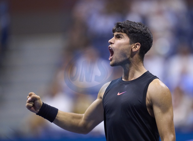 Carlos Alcaraz (ESP) reacts to a point when playing against Li Tu (AUS) in the first round on Arthur Ashe Stadium at the 2024 US Open Tennis Championships at the National Tennis centre, New York, New York, 27 Aug 2024., Credit:Peter van den Berg / Avalon