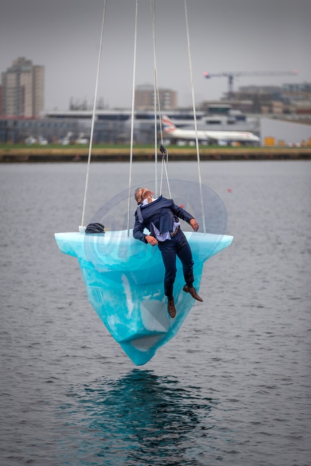 University of East London Docklands campus, UK. Saturday 24th and Sunday 25th August.Thaw is the a performance by Australian theatre company Legs on the wallPerformersperformed for 8 hours on a 2.7 tonne melting ice sculpture which was hoisted at times 20 meters in the air to a score by the Alaskan composer Matthew Burtner.Thaw addresses humankind's impact on the planet. The performance was part of the Greenwich and Docklands International Festival (GDIF) which is on from 23 August - 8th September., Credit:Abdullah Bailey / Avalon