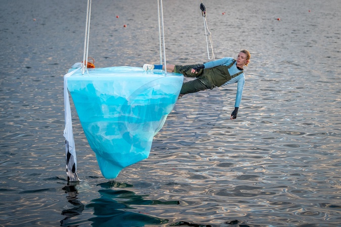 University of East London Docklands campus, UK. Saturday 24th and Sunday 25th August.Thaw is the a performance by Australian theatre company Legs on the wallPerformersperformed for 8 hours on a 2.7 tonne melting ice sculpture which was hoisted at times 20 meters in the air to a score by the Alaskan composer Matthew Burtner.Thaw addresses humankind's impact on the planet. The performance was part of the Greenwich and Docklands International Festival (GDIF) which is on from 23 August - 8th September., Credit:Abdullah Bailey / Avalon
