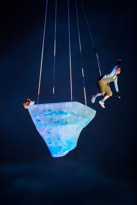 University of East London Docklands campus, UK. Saturday 24th and Sunday 25th August.Thaw is the a performance by Australian theatre company Legs on the wallPerformersperformed for 8 hours on a 2.7 tonne melting ice sculpture which was hoisted at times 20 meters in the air to a score by the Alaskan composer Matthew Burtner.Thaw addresses humankind's impact on the planet. The performance was part of the Greenwich and Docklands International Festival (GDIF) which is on from 23 August - 8th September., Credit:Abdullah Bailey / Avalon