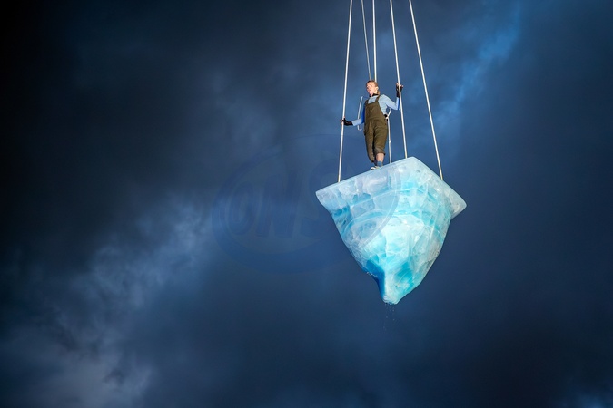 University of East London Docklands campus, UK. Saturday 24th and Sunday 25th August.Thaw is the a performance by Australian theatre company Legs on the wallPerformersperformed for 8 hours on a 2.7 tonne melting ice sculpture which was hoisted at times 20 meters in the air to a score by the Alaskan composer Matthew Burtner.Thaw addresses humankind's impact on the planet. The performance was part of the Greenwich and Docklands International Festival (GDIF) which is on from 23 August - 8th September., Credit:Abdullah Bailey / Avalon