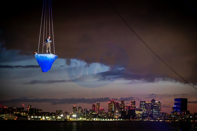University of East London Docklands campus, UK. Saturday 24th and Sunday 25th August.Thaw is the a performance by Australian theatre company Legs on the wallPerformersperformed for 8 hours on a 2.7 tonne melting ice sculpture which was hoisted at times 20 meters in the air to a score by the Alaskan composer Matthew Burtner.Thaw addresses humankind's impact on the planet. The performance was part of the Greenwich and Docklands International Festival (GDIF) which is on from 23 August - 8th September., Credit:Abdullah Bailey / Avalon