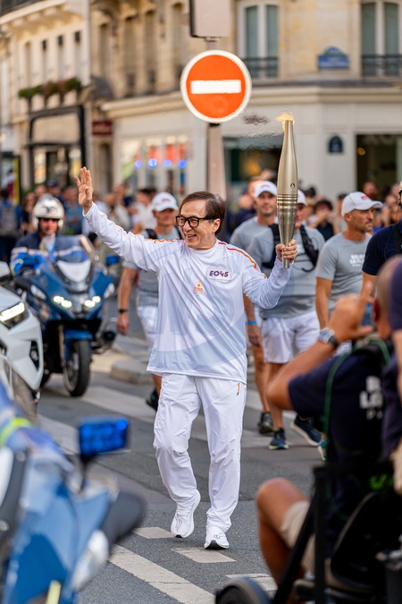 Jackie Chan porte la flamme des Jeux Paralympiques de Paris 2024, quelques heures avant la cérémonie d'ouverture le 28 août 2024. © Guillaume Boisserie / Bestimage Jackie Chan carries the flame for the Paris 2024 Paralympic Games, a few hours before the opening ceremony on August 28, 2024.