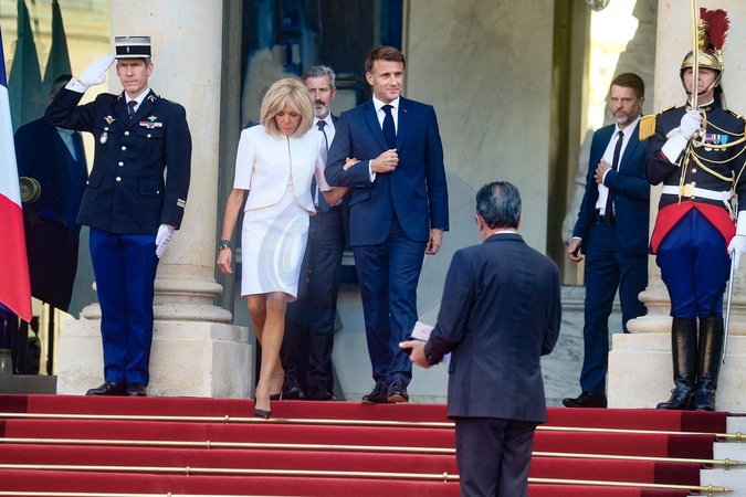 Prezydent Emmanuel Macron i jego żona Brigitte Macron witają głowy państw, rządów i organizacji międzynarodowych przed ceremonią otwarcia Igrzysk Paraolimpijskich Paryż 2024 w Pałacu Elizejskim w Paryżu