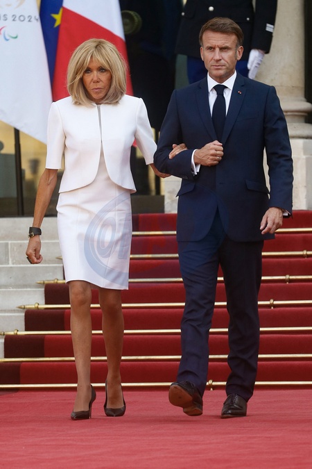 Prezydent Emmanuel Macron i jego żona Brigitte Macron witają głowy państw, rządów i organizacji międzynarodowych przed ceremonią otwarcia Igrzysk Paraolimpijskich Paryż 2024 w Pałacu Elizejskim w Paryżu