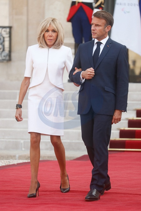 Prezydent Emmanuel Macron i jego żona Brigitte Macron witają głowy państw, rządów i organizacji międzynarodowych przed ceremonią otwarcia Igrzysk Paraolimpijskich Paryż 2024 w Pałacu Elizejskim w Paryżu