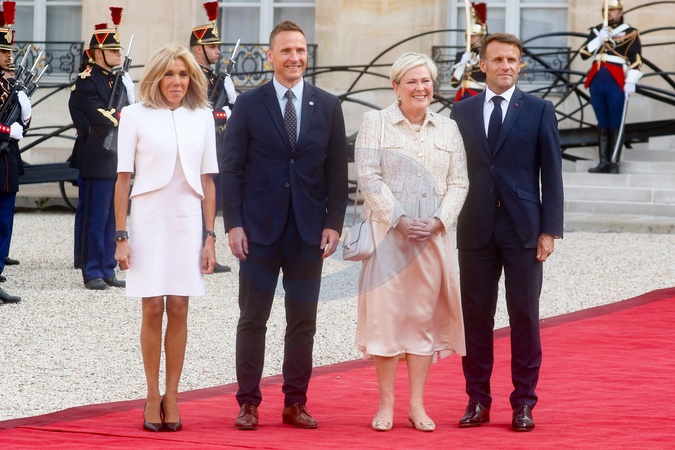 Brigitte Macron, Halla Tomasdottir (présidente d'Islande) et son mari Björn Skulason, Emmanuel Macron - Réception des chefs d'état, de gouvernement et d'organisation internationale en amont de la cérémonie d'ouverture des jeux paralympiques de Paris 2024 au palais de l'Elysée à Paris, France, le 28 août 2024. © Christophe Clovis / Bestimage President E.Macron and his wife B.Macron welcome heads of state, government and international organisations ahead of the opening ceremony of the Paris 2024 Paralympic Games at the Elysée Palace in Paris on august 28th 2024