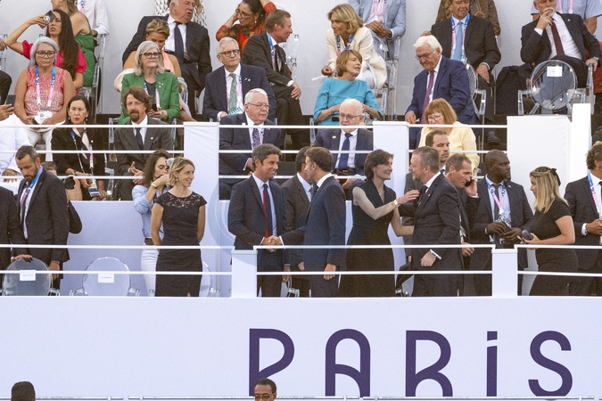 Gabriel Attal, premier ministre, le président Emmanuel Macron, Amélie Oudéa-Castera, ministre des sports, Andrew Parsons, président du comité international paralympique lors de la cérémonie d'ouverture des jeux paralympiques Paris 2024 place de la Concorde à Paris le 28 août 2024. © Perusseau / Jacovides / Bestimage Opening ceremony of the Paris 2024 Paralympic Games at Place de la Concorde in Paris on 28 August 2024.