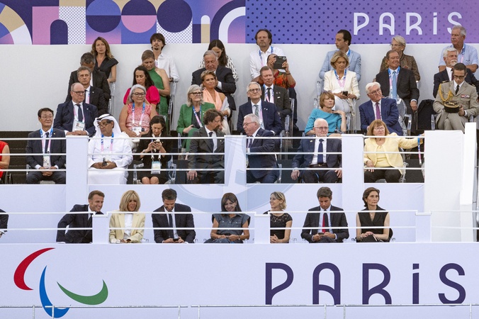 Le prince Albert II de Monaco, Gérard Larcher, Yaël Braun-Pivet, Le grand duc Henri de Luxembourg, Valérie Pécresse, Patrick Ollier, Michèle Alliot-Marie, le président Emmanuel Macron, Brigitte Macron, Tony Estanguet, Anne Hidalgo, maire de Paris, Marie-Amélie Le Fur, présidente du Comité paralympique et sportif français, Gabriel Attal, premier ministre, Amélie Oudéa-Castera, ministre des sports lors de la cérémonie d'ouverture des jeux paralympiques Paris 2024 place de la Concorde à Paris le 28 août 2024. © Perusseau / Jacovides / Bestimage Opening ceremony of the Paris 2024 Paralympic Games at Place de la Concorde in Paris on 28 August 2024.