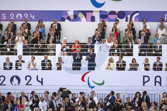 Andrew Parsons, président du comité international paralympique, le président Emmanuel Macron, Brigitte Macron, Tony Estanguet, Anne Hidalgo, maire de Paris, Marie-Amélie Le Fur, présidente du Comité paralympique et sportif français lors de la cérémonie d'ouverture des jeux paralympiques Paris 2024 place de la Concorde à Paris le 28 août 2024. © Perusseau / Jacovides / Bestimage Opening ceremony of the Paris 2024 Paralympic Games at Place de la Concorde in Paris on 28 August 2024.