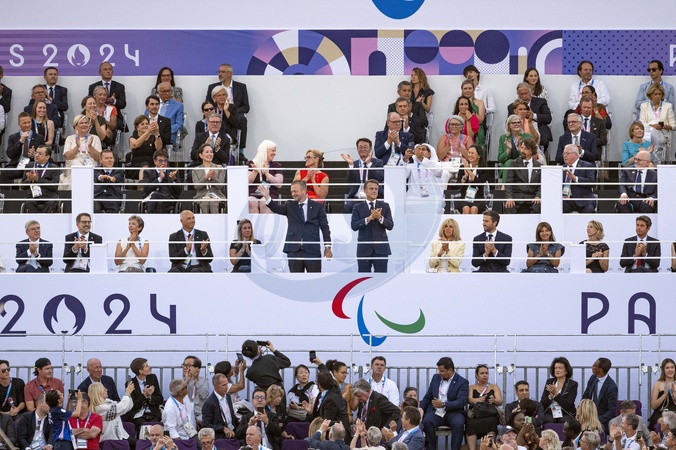 Andrew Parsons, président du comité international paralympique, le président Emmanuel Macron, Brigitte Macron, Tony Estanguet, Anne Hidalgo, maire de Paris, Marie-Amélie Le Fur, présidente du Comité paralympique et sportif français lors de la cérémonie d'ouverture des jeux paralympiques Paris 2024 place de la Concorde à Paris le 28 août 2024. © Perusseau / Jacovides / Bestimage Opening ceremony of the Paris 2024 Paralympic Games at Place de la Concorde in Paris on 28 August 2024.