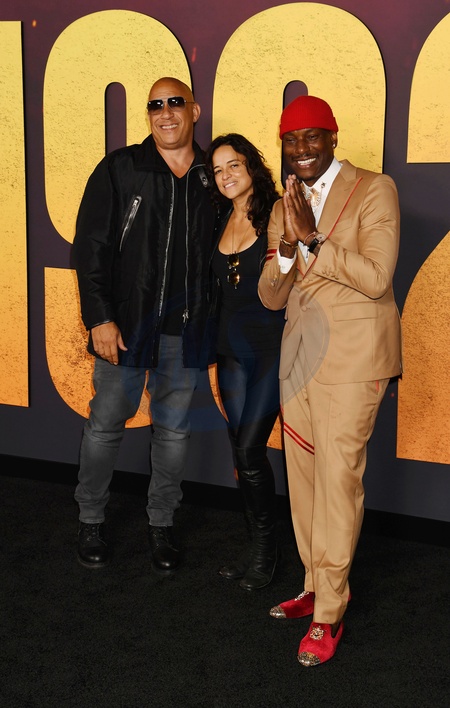 LOS ANGELES, CALIFORNIA - AUGUST 27: (L-R) Vin Diesel, Michelle Rodriguez and Tyrese Gibson attend the "1992" Los Angeles Premiere at Regal LA Live on August 27, 2024 in Los Angeles, California., Credit:Jeffrey Mayer / Avalon