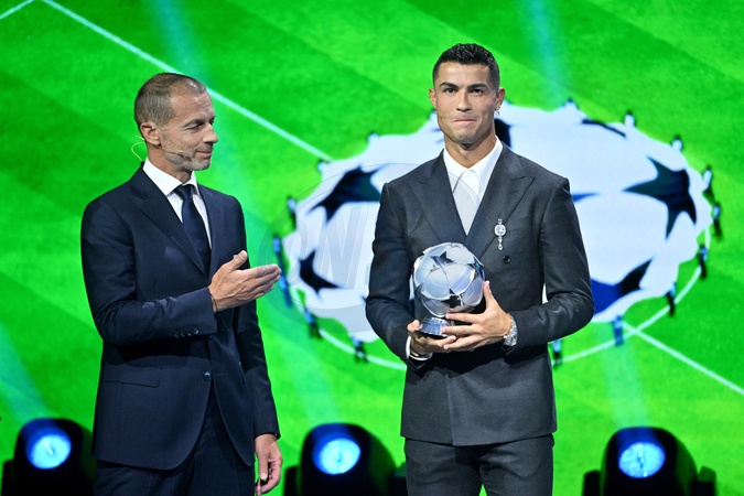 Cristiano Ronaldo reçoit le prix de meilleur buteur de tous les temps lors du tirage au sort UEFA pour la saison 2024/2025 au forum Grimaldi à Monaco