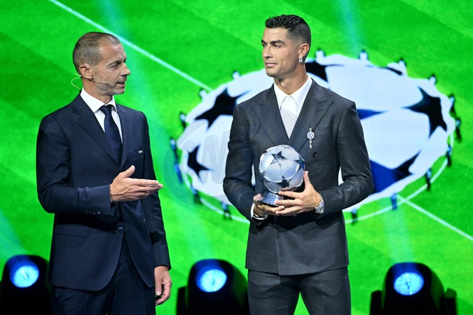 Aleksander Ceferin, le président de l'UEFA, et Cristiano Ronaldo durant le tirage au sort des rencontres de la phase régulière de la Ligue des champions pour la saison 2024-2025 et remises du prix du meilleur buteur de tous les temps de l'UEFA Champions League à Cristiano Ronaldo et du Prix du président de l'UEFA 2024 à Gianluigi Buffon, au Grimaldi Forum à Monaco, le 29 août 2024. © Bruno Bebert / Bestimage C.Ronaldo receives the award for all-time top scorer at the UEFA draw for the 2024/2025 season at the Grimaldi Forum in Monaco on august 29th 2024