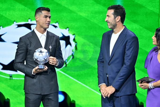 Cristiano Ronaldo et Gianluigi Buffon durant le tirage au sort des rencontres de la phase régulière de la Ligue des champions pour la saison 2024-2025 et remises du prix du meilleur buteur de tous les temps de l'UEFA Champions League à Cristiano Ronaldo et du Prix du président de l'UEFA 2024 à Gianluigi Buffon, au Grimaldi Forum à Monaco, le 29 août 2024. © Bruno Bebert / Bestimage C.Ronaldo receives the award for all-time top scorer at the UEFA draw for the 2024/2025 season at the Grimaldi Forum in Monaco on august 29th 2024