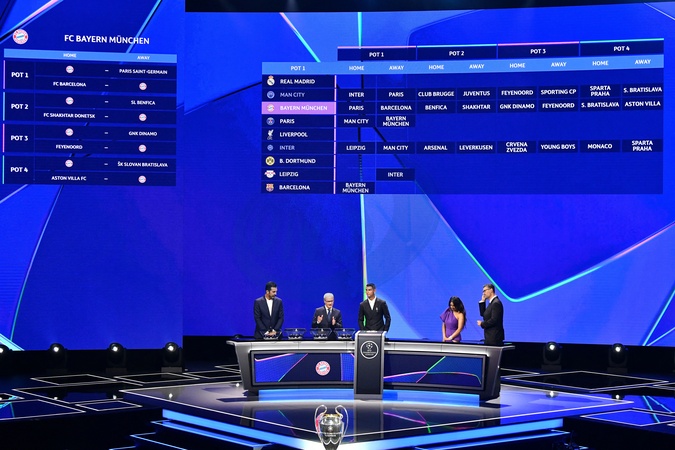 Gianluigi Buffon, Giorgio Marchetti, le vice secrétaire général de l'UEFA, Cristiano Ronaldo, Reshmin Chowdhury et Pedro Pinto, les présentateurs de la soirée, durant le tirage au sort des rencontres de la phase régulière de la Ligue des champions pour la saison 2024-2025 et remises du prix du meilleur buteur de tous les temps de l'UEFA Champions League à Cristiano Ronaldo et du Prix du président de l'UEFA 2024 à Gianluigi Buffon, au Grimaldi Forum à Monaco, le 29 août 2024. © Bruno Bebert / Bestimage C.Ronaldo receives the award for all-time top scorer at the UEFA draw for the 2024/2025 season at the Grimaldi Forum in Monaco on august 29th 2024