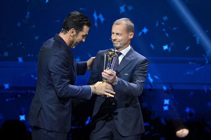 Gianluigi Buffon et Aleksander Ceferin, le président de l'UEFA, durant le tirage au sort des rencontres de la phase régulière de la Ligue des champions pour la saison 2024-2025 et remises du prix du meilleur buteur de tous les temps de l'UEFA Champions League à Cristiano Ronaldo et du Prix du président de l'UEFA 2024 à Gianluigi Buffon, au Grimaldi Forum à Monaco, le 29 août 2024. © Bruno Bebert / Bestimage C.Ronaldo receives the award for all-time top scorer at the UEFA draw for the 2024/2025 season at the Grimaldi Forum in Monaco on august 29th 2024