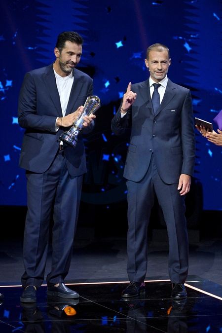 Gianluigi Buffon et Aleksander Ceferin, le président de l'UEFA, durant le tirage au sort des rencontres de la phase régulière de la Ligue des champions pour la saison 2024-2025 et remises du prix du meilleur buteur de tous les temps de l'UEFA Champions League à Cristiano Ronaldo et du Prix du président de l'UEFA 2024 à Gianluigi Buffon, au Grimaldi Forum à Monaco, le 29 août 2024. © Bruno Bebert / Bestimage C.Ronaldo receives the award for all-time top scorer at the UEFA draw for the 2024/2025 season at the Grimaldi Forum in Monaco on august 29th 2024